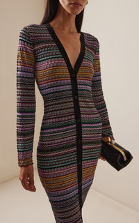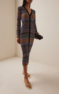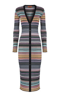 Few labels do relaxed glamour quite like storied Italian house Missoni. Ton be worn as dress or elongated cardigan, this piece is expertly knit with a refined zigzag pattern and illuminated by lame reflections. PRODUCT DETAILS - Pre-Fall '25 - Button fastening through front - Composition: 81% Rayon, 12% Metal Fiber, 6% Polyamide, 1% Elastane - Dry clean - Made in Italy SIZE & FIT - Designed for a slim fit