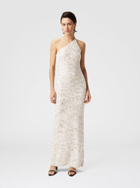 Elegant and structured, this long one-shoulder dress in sequined slub knit is a celebration of Missoni's savoir-faire. The front and back chevron pattern creates a dynamic visual effect, while the neck lace adds an element of delicacy that balances the asymmetrical silhouette. A garment designed to enhance the figure and capture the essence of the brand. MORE DETAILS - Slub sweater - Chevron Processing - Decorative Sequins - Stretch profiles Composition: EXTERNAL:45%Rayon, 29%Polyamide, 23%Polyester, 2%Metal Fiber, 1%Elastane; LINING : 82%Polyester, 18%Elastane Care instructions: Dry cleaning in tetrachloroethene - mild process ; Ironing maximum temperature 110°C - without steam ; Wash in net bag ; Iron inside out ; Dry flat ; Do not tumble dry ; Do not wash ; Do not bleach Made in: Italy Product ID DS25SG1FBK045BS01GI