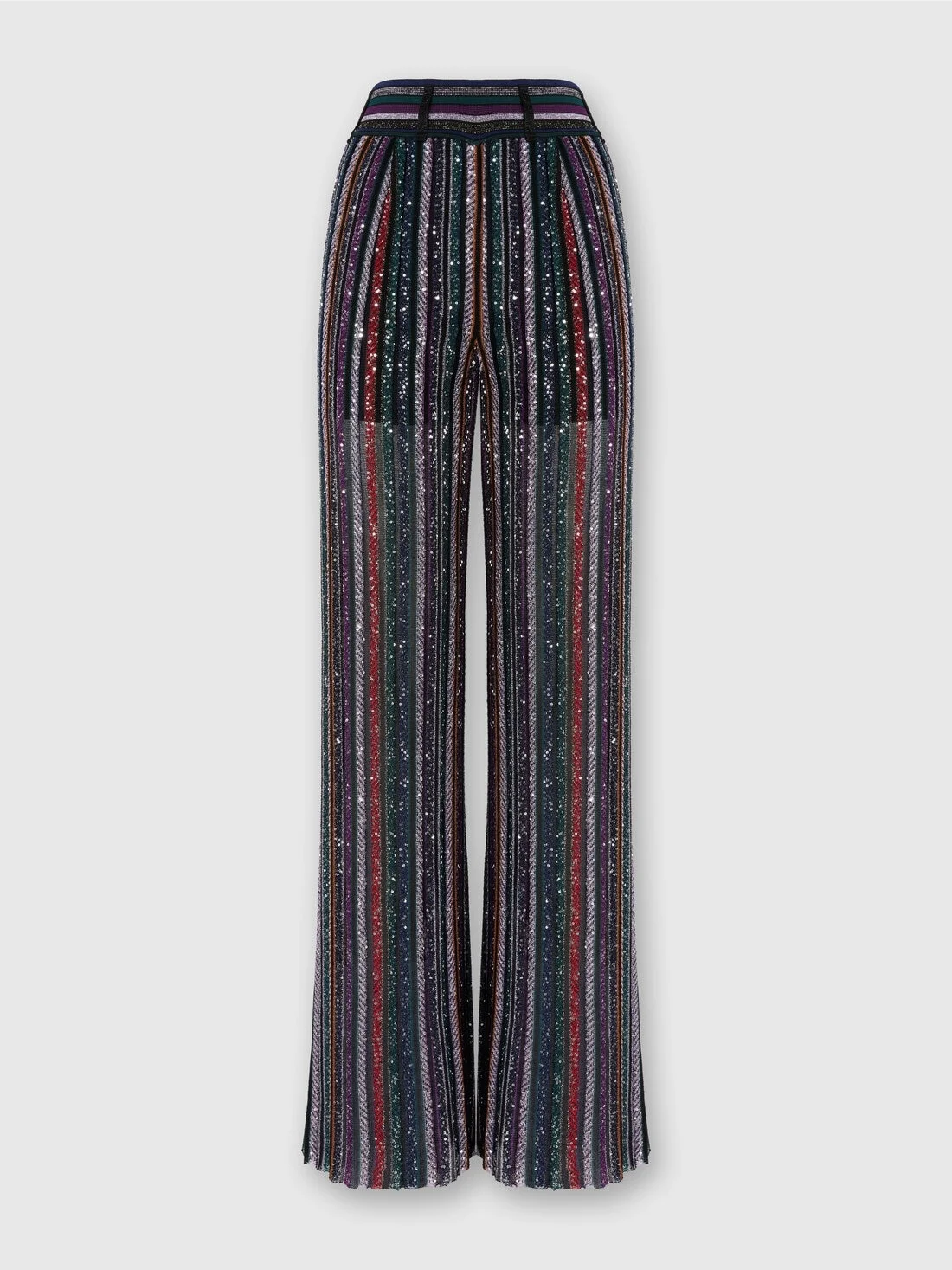 A long, straight-leg women’s trouser that plays with effects of light and transparency, made of herringbone striped knit in viscose blend with lame threads and sequins. A sophisticated and lightweight design, created to reflect every movement with elegance and personality. MORE DETAILS - Straight-leg long pants - Chevron stripe knit - Viscose blend with lame threads and sequins Composition: EXTERNAL:61%Rayon, 34%Polyamide, 4%Metal Fiber, 1%Elastane; LINING : 88%Polyester, 12%Elastane Care instructions: Ironing maximum temperature 110°C - without steam ; Dry cleaning in tetrachloroethene - mild process ; Wash in net bag ; Iron inside out ; Dry inside out ; Do not tumble dry ; Dry flat ; Do not wash ; Do not bleach Made in: Italy Product ID DS25WI09BK01C3SM9T4