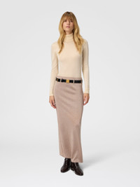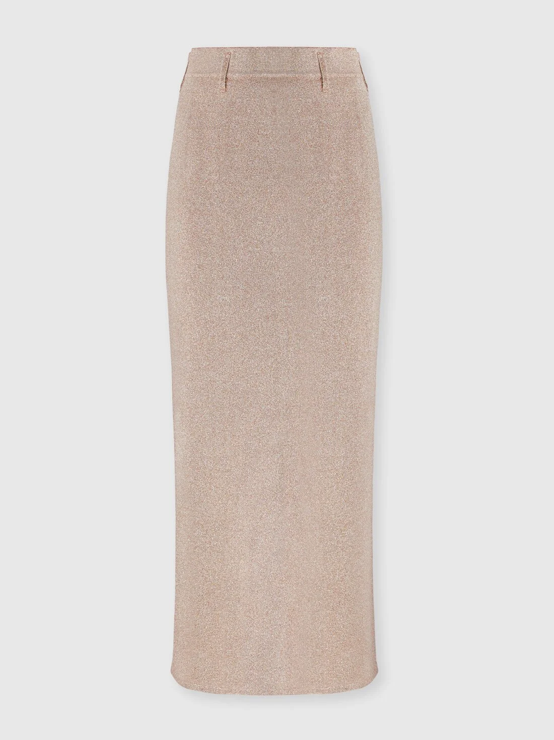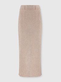 Women’s pencil skirt with essential and impeccable cut, enhanced by fine vanise workmanship in viscose blend with lame threads that give it an elegant glow. The back slit adds comfort and a touch of discreet femininity, making it ideal for sophisticated and refined outfits. MORE DETAILS - Long skirt with slit - Vanise knit - Viscose blend with lame threads Composition: EXTERNAL:85%Rayon, 12%Metal Fiber, 2%Polyamide, 1%Elastane Care instructions: Dry cleaning in tetrachloroethene - mild process ; Ironing maximum temperature 110°C - without steam ; Do not tumble dry ; Iron inside out ; Dry inside out ; Dry flat ; Iron with a cloth between ; Do not wash ; Do not bleach Made in: Romania Product ID DS25WH00BK01BYL201F