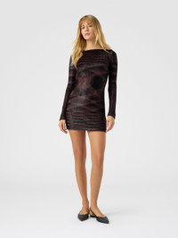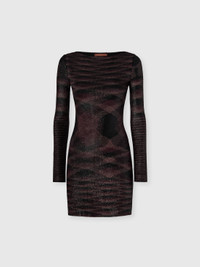 Bold elegance takes form in this women’s mini dress with long sleeves and a bateau neckline—a perfect balance of refined texture and modern design. Made in furry stitch, it softly embraces the silhouette, while the sprayed slub motif gives a dynamic, material look. The viscose-wool blend enhances the structure, making it a bold, modern piece for those who want to leave a mark with sophistication and personality. MORE DETAILS - Mini boatneck evening dress with long sleeves - Fur-stitch knit - Flamed and coated pattern - Wool and viscose blend Composition: EXTERNAL:53%Rayon, 47%Wool Care instructions: Hand wash ; Do not tumble dry ; Dry flat ; do not soak ; Do not dry clean ; Do not iron ; Ripetuti lavaggi tendono naturalmente a diminuire l’effetto speculare della lavorazione ; Cool Hand Wash ; Do not bleach Made in: Italy Product ID DS25WG2JBT00AIF903J