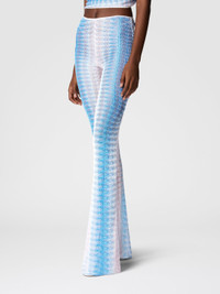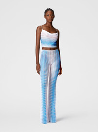 A low-waisted, flared design in degrade lace with the iconic zigzag pattern. The slight transparency of the fabric adds a sensual touch to a sophisticated and versatile piece. MORE DETAILS - Women's low-rise pants - Flared design - Degrade lace workmanship - Viscose and lame fabric Composition: EXTERNAL:93%Rayon, 7%Metal Fiber Care instructions: Ironing maximum temperature 110°C - without steam ; Dry cleaning in tetrachloroethene ; Do not tumble dry ; Do not wash ; Do not bleach Made in: Italy Product ID MC25SI00BR0131S72L3