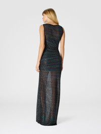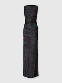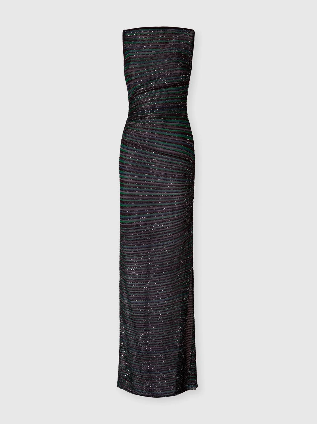 Sophisticated elegance and modern refinement meet in this long women’s dress with a boat neckline. The viscose-blend striped knit, enriched with lame threads and sequins, discreetly captures the light, creating a luminous effect that gracefully wraps the silhouette. A garment that blends modernity with timeless class, perfect for any elegant occasion. MORE DETAILS - Long dress - Sleeveless - Boat neckline - Striped knit - Lurex threads and sequins - Viscose blend Composition: EXTERNAL:70%Rayon, 23%Polyamide, 7%Metal Fiber Care instructions: Ironing maximum temperature 110°C - without steam ; Dry cleaning in tetrachloroethene - mild process ; Wash in net bag ; Dry flat ; Iron inside out ; Do not tumble dry ; Dry inside out ; Do not wash ; Do not bleach Made in: Italy Product ID DS25WG12BK01CLSM9T6