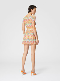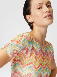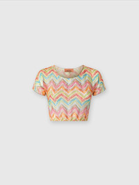 The tulle crop top with Missoni's iconic zig zag motif stands out for its raschel workmanship, which gives depth and texture to the garment. The light and transparent fabric plays with the see-through, enhancing the modernity of the design. A piece that perfectly combines the graphic energy of the Missoni motif with a contemporary silhouette, ideal for those looking for a bold and refined style. MORE DETAILS - Crop T-shirt - Tulle Printed - Raschel - Zig zag pattern Composition: EXTERNAL:100%Polyester Care instructions: Ironing maximum temperature 110°C - without steam ; Dry cleaning in tetrachloroethene ; Do not tumble dry ; Do not wash ; Do not bleach Made in: Italy Product ID MC25SK00BR010XSM9N5