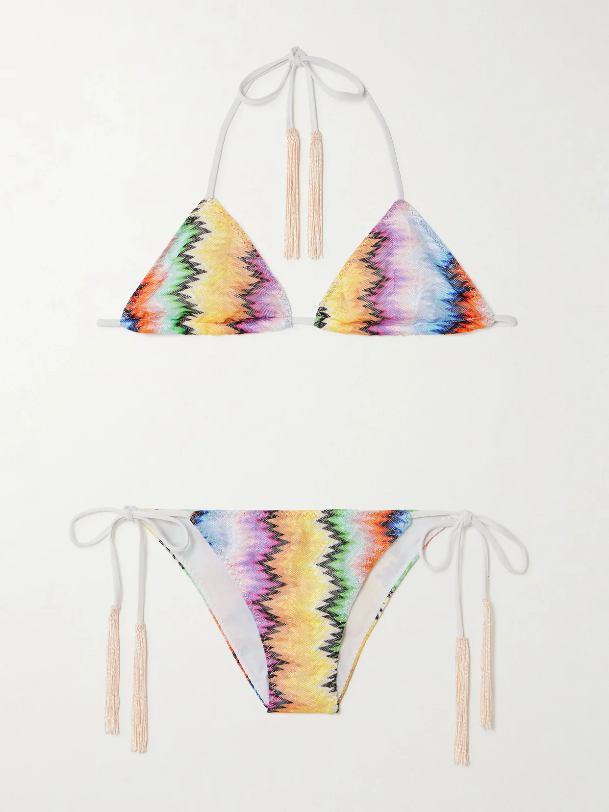 EXCLUSIVE AT NET-A-PORTER. Missoni Mare's bikini is designed with beaded fringe that dangles from the adjustable ties at the nape and hips. It's made from signature crochet-knit in a chevron striped pattern and has a triangle top and medium-coverage briefs.
