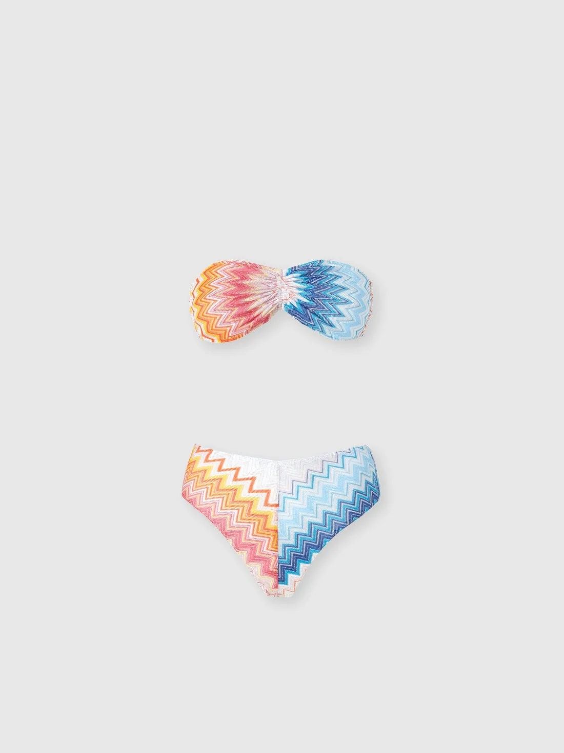 The Missoni bandeau bikini, crafted from a viscose blend with a degrade lame zigzag pattern, expresses the sophisticated essence of the brand. The bandeau top, which is delicately tied at the back of the neck, and the matching high-waisted brief, stand out for the brilliance of the lurex that lights up the raschel fabric. A design that combines chromatic dynamism and refinement. MORE DETAILS - Bandeau bikini - Viscose and lame blend - Zig zag pattern Composition: EXTERNAL:90%Rayon, 6%Polyester, 4%Polyamide; LINING : 80%Polyamide, 20%Elastane Care instructions: Hand wash ; Do not tumble dry ; Do not dry clean ; Do not iron ; Do not bleach Made in: Italy Product ID MS25SP00BR00ZYSM9MW