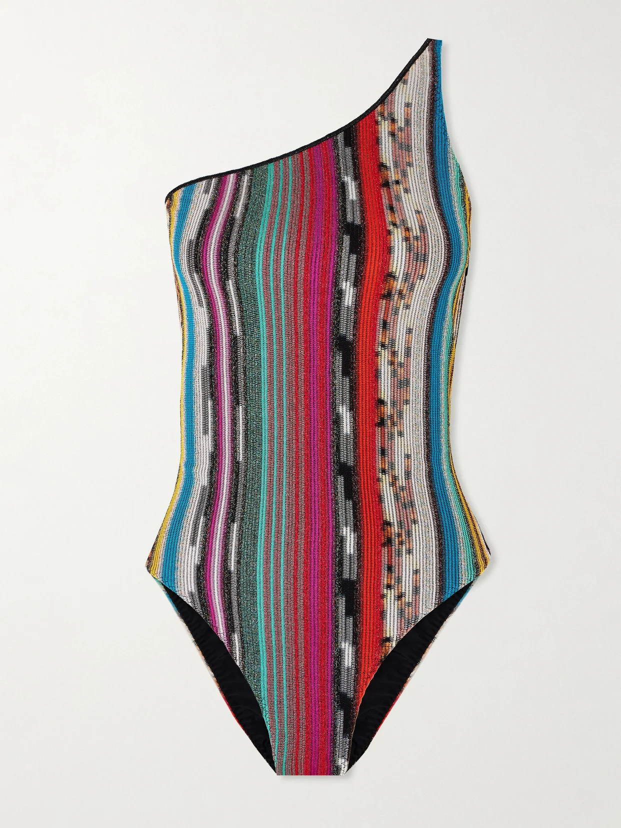 The joy and freedom of vacations underscore Missoni Mare's collection. This swimsuit has been crochet-knitted in Italy and flecked with metallic fibers that glisten in the light and highlight the signature striped pattern. The one-shoulder neckline and high legs emphasize your natural shape.