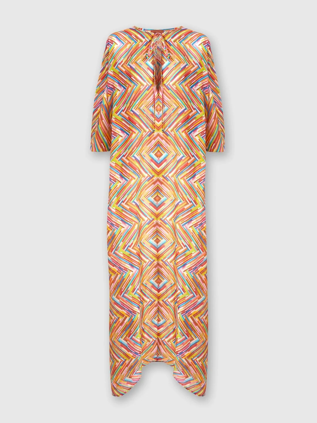 Lightweight and enveloping, the long kaftan in a cotton and silk blend is characterized by a print that catches the eye with its liveliness. The puffed sleeves add volume and fluidity to the design, while the contoured V-neckline, adjustable with delicate ties around the neck, adds a touch of versatility and sophistication. A garment that combines freedom of movement and refinement, expressing the art of knowing how to dress lightly. MORE DETAILS - Long model kaftan - Cotton and silk blend - Greek pattern - Adjustable V-neck Composition: EXTERNAL:78%Cotton, 22%Silk Care instructions: Ironing maximum temperature 110°C - without steam ; Dry cleaning in tetrachloroethene ; Do not tumble dry ; Do not wash ; Do not bleach Made in: Italy Product ID MS25SQ0WBW00UUSM9N1