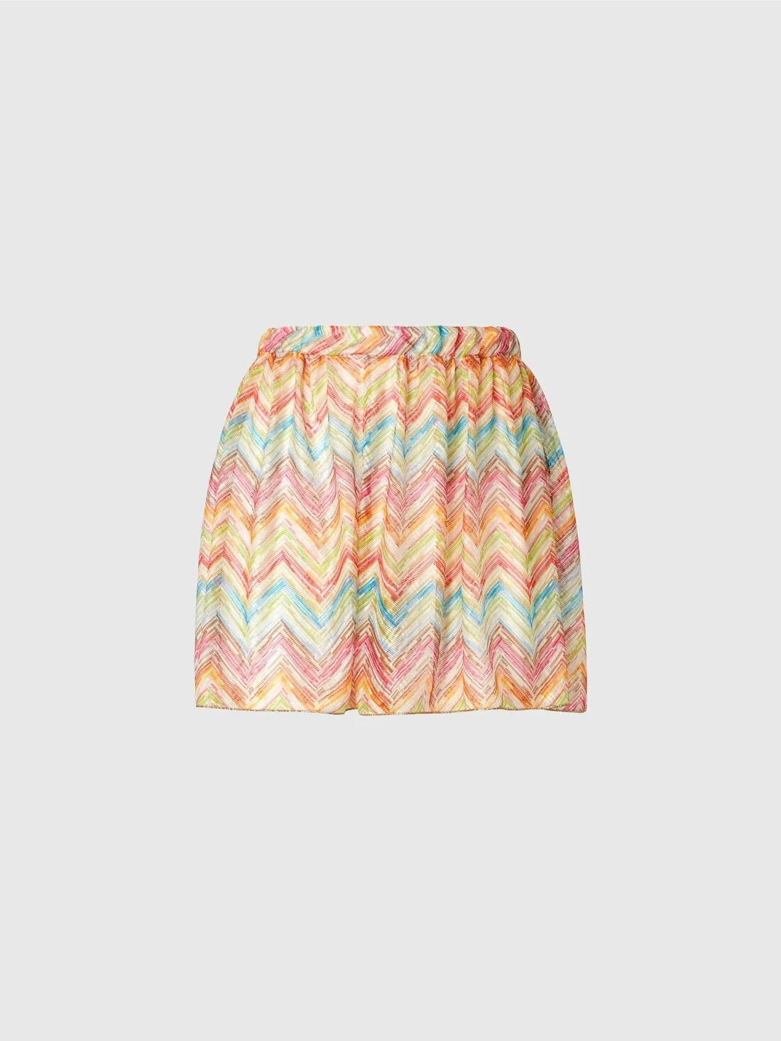 A vibrant zigzag pattern animates these raschel tulle cover-up shorts. The loose cut and elastic waistband ensure a comfortable fit, while the print adds a touch of elegant panache to any summer look. A lightweight and versatile garment, perfect for completing the beach wardrobe in style. MORE DETAILS - Cover-up shorts - Tulle Printed - Zig zag pattern - Raschel processing Composition: EXTERNAL:100%Polyester Care instructions: Ironing maximum temperature 110°C - without steam ; Dry cleaning in tetrachloroethene ; Do not tumble dry ; Do not wash ; Do not bleach Made in: Italy Product ID MC22SI00BR010XSM9N5