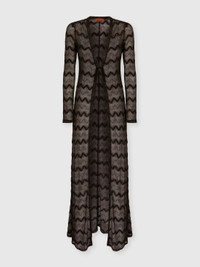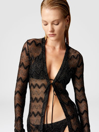 A play of light and shadow that he discreetly reveals. The long lame viscose cardigan by Missoni, with its iconic zigzag motifs, embraces the body lightly, leaving room for sensual transparencies. A refined example of the maison's savoir faire, where elegance and craftsmanship come together in a timeless classy garment. MORE DETAILS - Long model cardigan - Viscose lame - Zigzag pattern Composition: EXTERNAL:91%Rayon, 9%Metal Fiber Care instructions: Ironing maximum temperature 110°C - without steam ; Dry cleaning in tetrachloroethene ; Do not tumble dry ; Do not wash ; Do not bleach Made in: Italy Product ID MC25SQ00BR00ZXS91N1