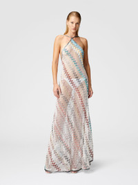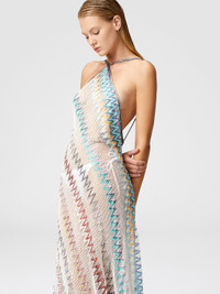 The mesh cover-up dress with zigzag pattern and sequins is a celebration of transparency and light. Crafted from lightweight, shimmering fabric, the garment features a halter neckline and an open back, with contrasting straps that add a graphic touch. The mesh work creates a seductive and sophisticated effect, transforming this dress into a key piece for a summer look with a glamorous and refined spirit. MORE DETAILS - Long cover-up dress - Mesh Processing - Zig zag pattern - Sequin inserts - Halter neckline Composition: EXTERNAL:95%Rayon, 3%Polyamide, 2%Polyester Care instructions: Ironing maximum temperature 110°C - without steam ; Dry cleaning in tetrachloroethene ; Do not tumble dry ; Do not wash ; Do not bleach Made in: Italy Product ID MS25SQ16BV00GQSM9MV
