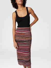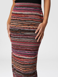 This midi skirt, created with the mastery of Missoni, stands out for its embossed viscose and lame fabric and the wave pattern symbol of the maison. A fluid and elegant garment, designed for those who want to wear the iconic refinement of the brand on every occasion. MORE DETAILS - Midi skirt - Embossed viscose lame - Wave pattern Composition: EXTERNAL:79%Rayon, 19%Metal Fiber, 1%Elastane, 1%Polyamide; LINING : 82%Polyester, 18%Elastane Care instructions: Dry cleaning in tetrachloroethene - mild process ; Ironing maximum temperature 110°C - without steam ; Do not tumble dry ; Dry flat ; Iron inside out ; Dry inside out ; Do not wash ; Do not bleach Made in: Croatia Product ID DS25SH09BK042CS416H