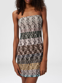 This mini dress embodies a luminous and modern femininity. Made from striped lace raschel knit, it is enriched with lame threads that bring iridescent reflections to life. The graphic pattern and attention to detail highlight the refinement of this piece, which naturally blends craftsmanship and contemporary style. MORE DETAILS - Mini dress - Raschel knit with striped lace-effect - Lurex threads - Viscose blend Composition: EXTERNAL:92%Rayon, 8%Metal Fiber; LINING : 77%Polyamide, 23%Elastane Care instructions: Dry cleaning in tetrachloroethene - mild process ; Ironing maximum temperature 110°C - without steam ; Do not tumble dry ; Dry flat ; Do not wash ; Do not bleach Made in: Italy Product ID DS25WG23BR012ISM9QX