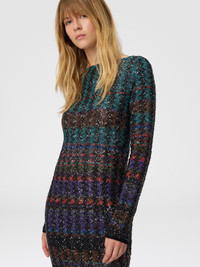 A women’s mini dress that plays with transparency and motion. The boat neckline and Missoni’s signature chevron-striped pattern create a unique graphic effect, while lame threads and sequins give the fabric a brilliant shimmer. A bold, elegant statement piece. MORE DETAILS - Mini dress - Long sleeves - Boat neckline - Chevron motif - Viscose blend - Lurex threads Composition: EXTERNAL:56%Polyamide, 31%Rayon, 13%Polyester Care instructions: Dry cleaning in tetrachloroethene - mild process ; Ironing maximum temperature 110°C - without steam ; Wash in net bag ; Do not tumble dry ; Steam iron only ; Iron inside out ; Dry flat ; Do not wash ; Do not bleach Made in: Italy Product ID DS25WG0ZBK01CKSM9T0
