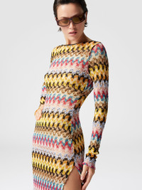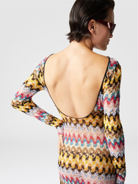 The long dress in lame viscose lace by Missoni stands out for its sophisticated elegance and craftsmanship. The zigzag pattern, illuminated by lame, gives the garment a luminous and dynamic effect, while the fluid and light silhouette envelops the figure with grace. The most seductive detail is the open back, which adds a sensual and refined touch. MORE DETAILS - Long dress - Lame viscose lace - Backless - Zigzag pattern Composition: EXTERNAL:95%Rayon, 5%Metal Fiber Care instructions: Ironing maximum temperature 110°C - without steam ; Dry cleaning in tetrachloroethene ; Do not tumble dry ; Do not wash ; Do not bleach Made in: Italy Product ID MS25SQ14BR0000S91NA