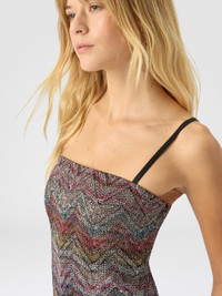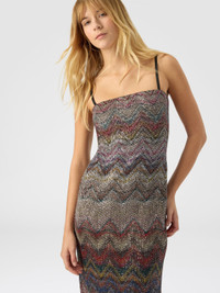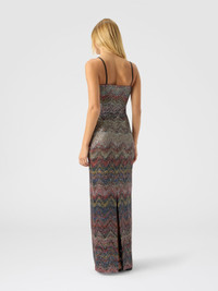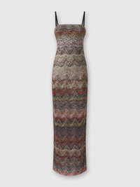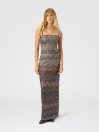 This long strapless bustier dress embodies bold, luminous elegance. Made from a viscose blend with exclusive Caperdoni loom craftsmanship, it features a refined gradient zigzag motif enriched with lame threads and sequins that add light and depth to the fabric. The fitted bustier shape enhances the figure, making it ideal for the most special occasions. MORE DETAILS - Bustier long dress - Sleeveless - Caperdoni loom knit - Zig zag motif - Lurex threads and sequins - Viscose blend Composition: EXTERNAL:55%Rayon, 41%Polyamide, 4%Metal Fiber; INTERNAL REINFORCEMENT:100%Polyester; LINING : 82%Polyester, 18%Elastane Care instructions: Dry cleaning in tetrachloroethene - mild process ; Dry flat ; Do not tumble dry ; Steam iron only ; Do not iron ; Do not wash ; Do not bleach Made in: Italy Product ID DS25WG1UBC005ES4176