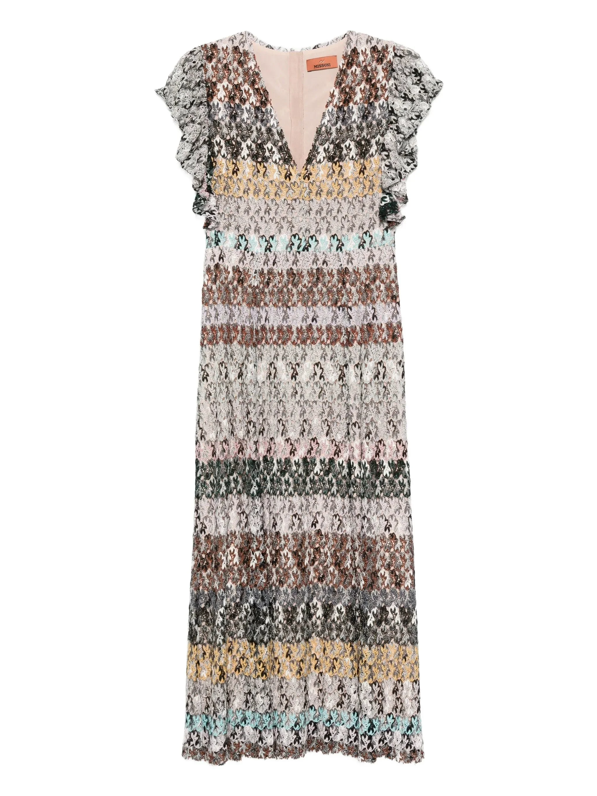 multicolour v-neck ruffled sleeves midi length The item you receive may differ slightly from the item photographed. This is due to the artisanal nature with which all Missoni products are constructed. - Color: BLACK/BROWN - Made in: Italy - Designer Style ID: DS25WG26 BR012I SM9QX Composition and care Lining Composition Polyester: 82.0%, Outer Composition Viscose: 92.0%, Lining Composition Elastane: 18.0%