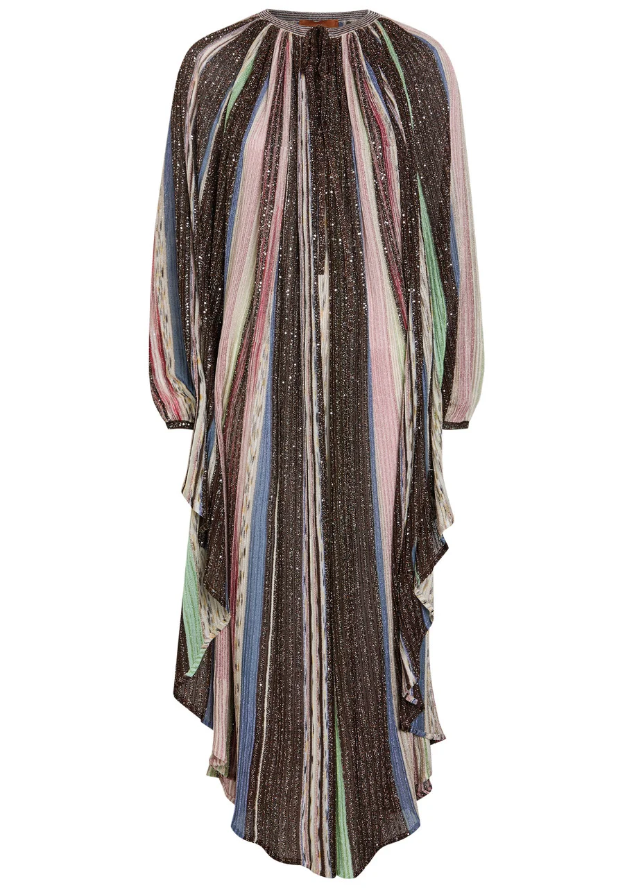 Info & Care Missoni fine-knit dress Striped, metallic weave, V-neck with tie fastening, dolman sleeves Slips on 75% viscose, 13% polyamide, 12% metallised fibres Hand wash Size & Fit Length shoulder to hem: 52 inches/ 132cm Midweight Loose fit Model is 5'10"/ 178cm and wears a size;IT40