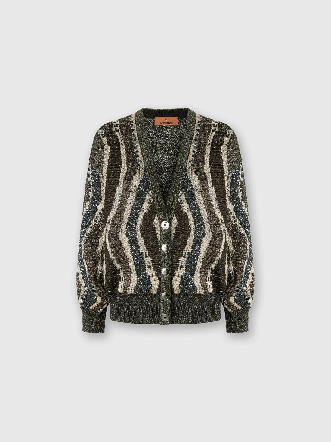 Boxy women’s cardigan with a modern character, featuring buttons and made of jacquard with a distinctive wave motif. The applied sequins give the garment a touch of brightness, making it perfect for adding an elegant and dynamic detail to any outfit. MORE DETAILS - Boxy buttoned cardigan - Jacquard knit - Wave pattern - Viscose blend with sequins and lame threads Composition: EXTERNAL:49%Rayon, 44%Polyamide, 7%Metal Fiber Care instructions: Ironing maximum temperature 110°C - without steam ; Dry cleaning in tetrachloroethene - mild process ; Wash in net bag ; Dry flat ; Dry inside out ; Do not tumble dry ; Iron inside out ; Do not wash ; Do not bleach Made in: Italy Product ID DS25WM0CBK01C8S80E2