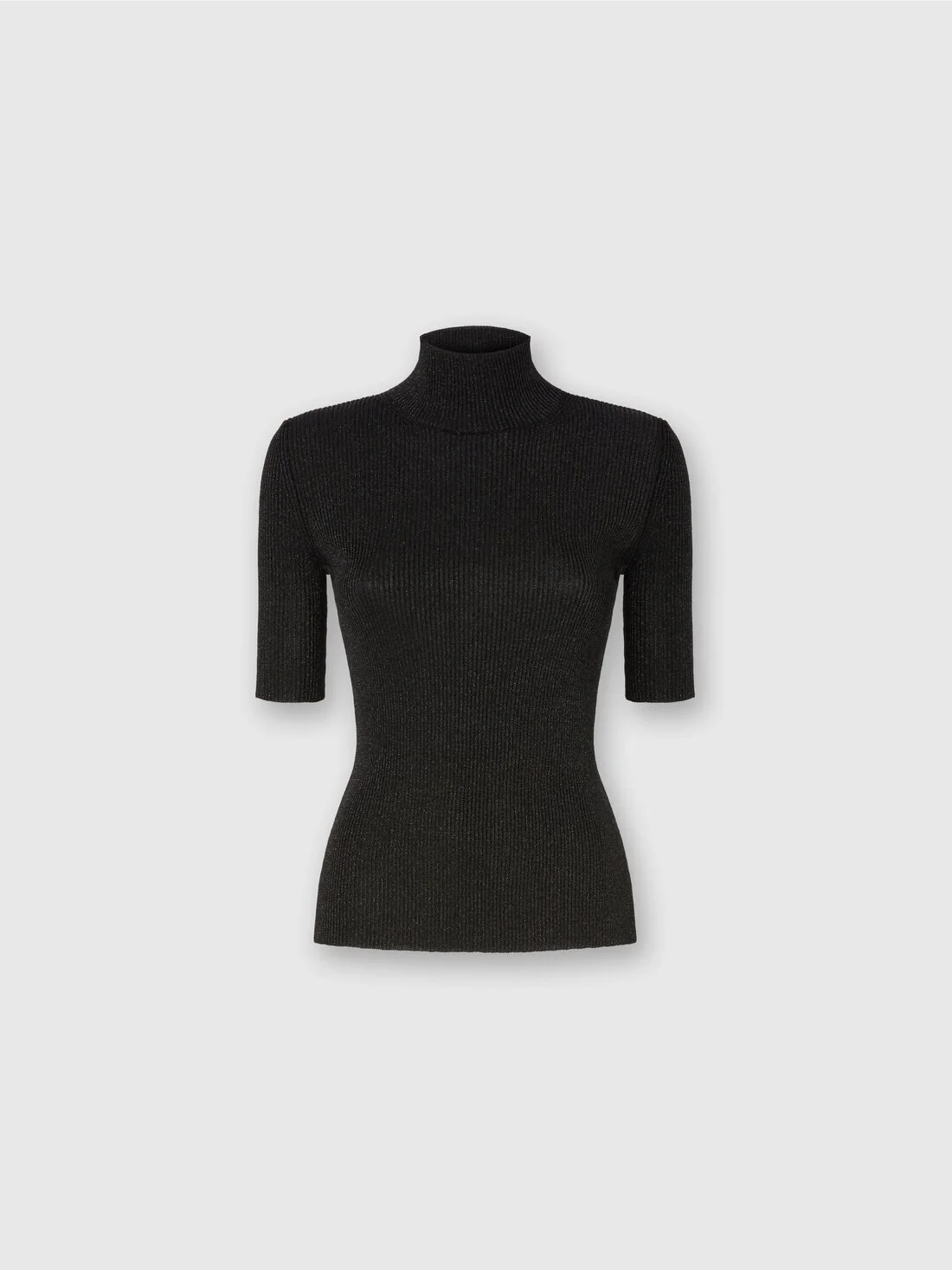 Perfect as a foundation for seasonal looks, this short-sleeve mock-neck women’s sweater in viscose and wool blend features refined vanise workmanship enriched with fine lame threads. The result is a versatile and luminous garment, ideal for adding a touch of discreet elegance to any outfit. MORE DETAILS - Short-sleeve mock neck sweater - Vanise knit - Viscose blend with lame threads Composition: EXTERNAL:88%Rayon, 12%Metal Fiber Care instructions: Dry cleaning in tetrachloroethene - mild process ; Ironing maximum temperature 110°C - without steam ; Do not tumble dry ; Dry flat ; Iron inside out ; Dry inside out ; Iron with a cloth between ; Do not wash ; Do not bleach Made in: Romania Product ID DS25WN13BK01BYL905E
