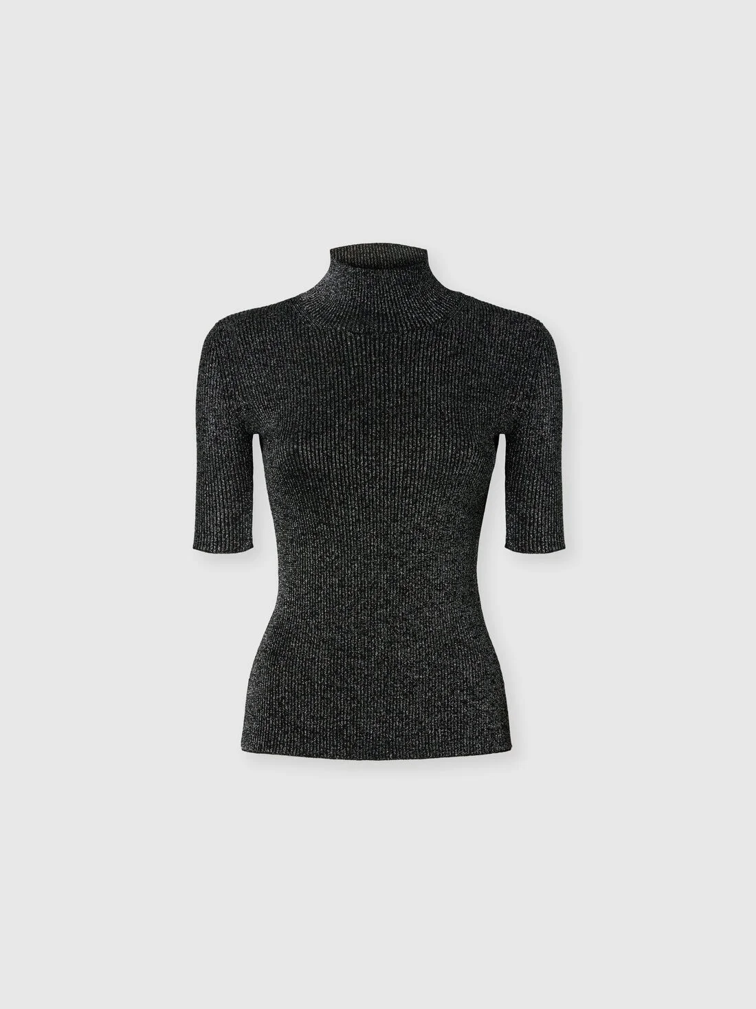 Perfect as a foundation for seasonal looks, this short-sleeve mock-neck women’s sweater in viscose and wool blend features refined vanise workmanship enriched with fine lame threads. The result is a versatile and luminous garment, ideal for adding a touch of discreet elegance to any outfit. MORE DETAILS - Short-sleeve mock neck sweater - Vanise knit - Viscose blend with lame threads Composition: EXTERNAL:88%Rayon, 12%Metal Fiber Care instructions: Dry cleaning in tetrachloroethene - mild process ; Ironing maximum temperature 110°C - without steam ; Do not tumble dry ; Dry flat ; Iron inside out ; Dry inside out ; Iron with a cloth between ; Do not wash ; Do not bleach Made in: Romania Product ID DS25WN13BK01BYL905D