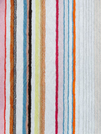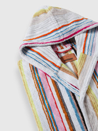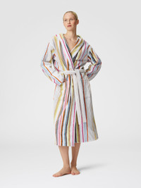 The Moonshadow cotton terry bathrobe features a refined vertical striped pattern, enhanced by subtle lurex inserts that add a touch of shimmer. Coloured vertical stripes arranged in different densities create a dynamic visual effect on the soft chevron terry. Complete with waist belt, hood and patch pockets, it is the perfect accessory to add a touch of glamour to your daily routine. MORE DETAILS - Cotton terry bathrobe with lurex - Pattern with stripes - Waist belt - Hood - Patch pockets Composition: EXTERNAL:97%Cotton, 3%Metal Fiber Care instructions: Ironing maximum temperature 150°C ; Do not dry clean ; Tumble drying at lower temperature ; Wash max 40°C ; Do not bleach Made in: Portugal Product ID 1D3AC99710100
