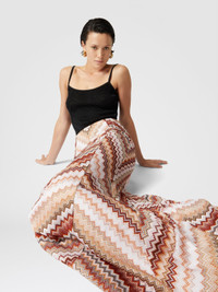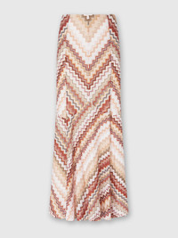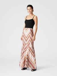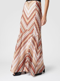 A play of lines and colors unfolds in this long flared skirt, where the serrated zigzag pattern and lame create a luminous and dynamic effect. The raschel workmanship emphasizes the complexity of the design, paying homage to Missoni's craftsmanship heritage. A garment that speaks of movement, light and refinement without compromise. MORE DETAILS - Mini skirt with slit - Iconic serrated zigzag pattern - Lame filaments Composition: EXTERNAL:79%Rayon, 11%Metal Fiber, 10%Polyamide; LINING : 100%Polyester Care instructions: Dry cleaning in tetrachloroethene - mild process ; Dry flat ; Steam iron only ; Do not tumble dry ; Do not wash ; Do not iron ; Do not bleach Made in: Italy Product ID DS25SH0FBR00ZVS10BB