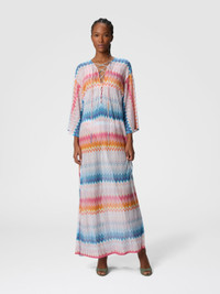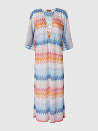 From Missoni's exotic heritage, the long cover-up caftan in viscose blend embodies the timeless elegance of the maison. The zigzag pattern intertwines with the metallic reflections of the lame, creating a harmony of light and color. The plunging V-neckline, embellished with laces that add movement and dynamism, enhances the silhouette with a touch of sophisticated sensuality. MORE DETAILS - Long cover-up kaftan - Viscose and lame blend - Zigzag pattern - V-neck Composition: EXTERNAL:90%Rayon, 6%Polyester, 4%Polyamide Care instructions: Ironing maximum temperature 110°C - without steam ; Dry cleaning in tetrachloroethene ; Do not tumble dry ; Do not wash ; Do not bleach Made in: Italy Product ID MC23SQ06BR00ZYSM9MW