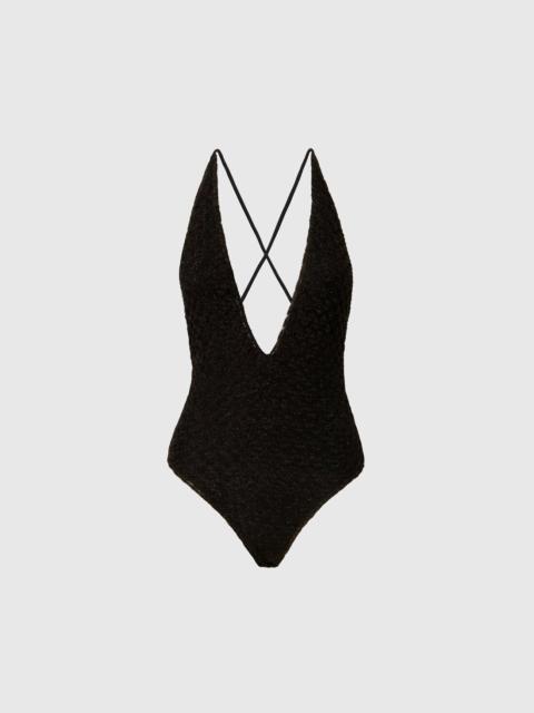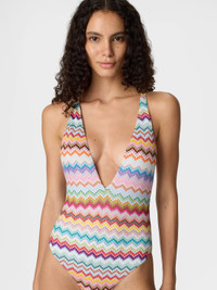 MORE DETAILS - Women's one-piece swimsuit - Deep V-neckline - Crossed straps at the back - Raschel knit - Micro zigzag pixel-effect pattern - Viscose lame blend Composition: EXTERNAL:83%Rayon, 17%Metal Fiber; LINING : 80%Polyamide, 20%Elastane Care instructions: Hand wash ; Do not tumble dry ; Do not dry clean ; Do not iron ; Cool Hand Wash ; Do not bleach Made in: Italy Product ID MC22SP03BR014FSM9WV