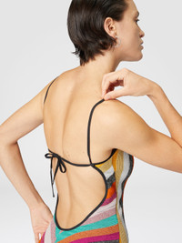 This striped rib knit one-piece combines style and innovation with a bandeau design that gently hugs the silhouette. The contrasting laces, which decorate the shoulders and back, create a dynamic and sophisticated play of contrasts, while the brilliance of the lame adds a touch of light to the fabric. An iconic garment that combines the luxury of the Missoni tradition with a minimal and contemporary design. MORE DETAILS - One-piece swimsuit - Contrasting suspenders - Striped pattern - Ribbed and lame knit Composition: EXTERNAL:79%Rayon, 21%Metal Fiber; LINING : 80%Polyamide, 20%Elastane Care instructions: Hand wash ; Do not tumble dry ; Do not dry clean ; Do not iron ; Do not bleach Made in: Italy Product ID MC23SP03BT0092SM9MU