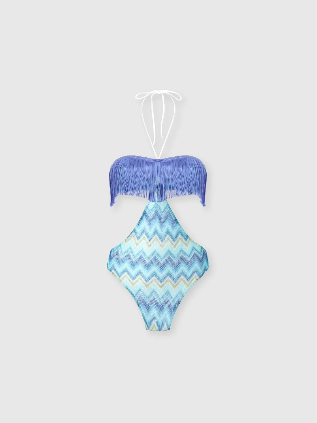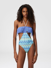With a graphic and bold design, this one-piece swimsuit for women with fringe at the front is made with raschel workmanship and features a print of shaded micro and macro stripes on a zigzag background, an iconic style code of Missoni. A garment full of personality, designed for those who want a distinctive and vibrant look. MORE DETAILS - Women's one-piece swimsuit with fringe - Raschel knit with shaded macro and micro stripe pattern - Zigzag background Composition: EXTERNAL:100%Polyester; TRIMMING:60%Rayon, 40%Metal; Sewing thread:100%Polyester; INSERTS:100%Acetate; LINING : 80%Polyamide, 20%Elastane Care instructions: Hand wash ; Do not tumble dry ; COOL HAND WASH ; Do not dry clean ; Do not iron ; Do not bleach Made in: Italy Product ID MC25WP01BR013XS72NP