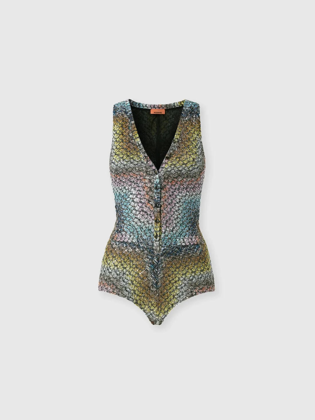 One-piece V-neck swimsuit with buttons in a Greek-style zigzag knit with sequins