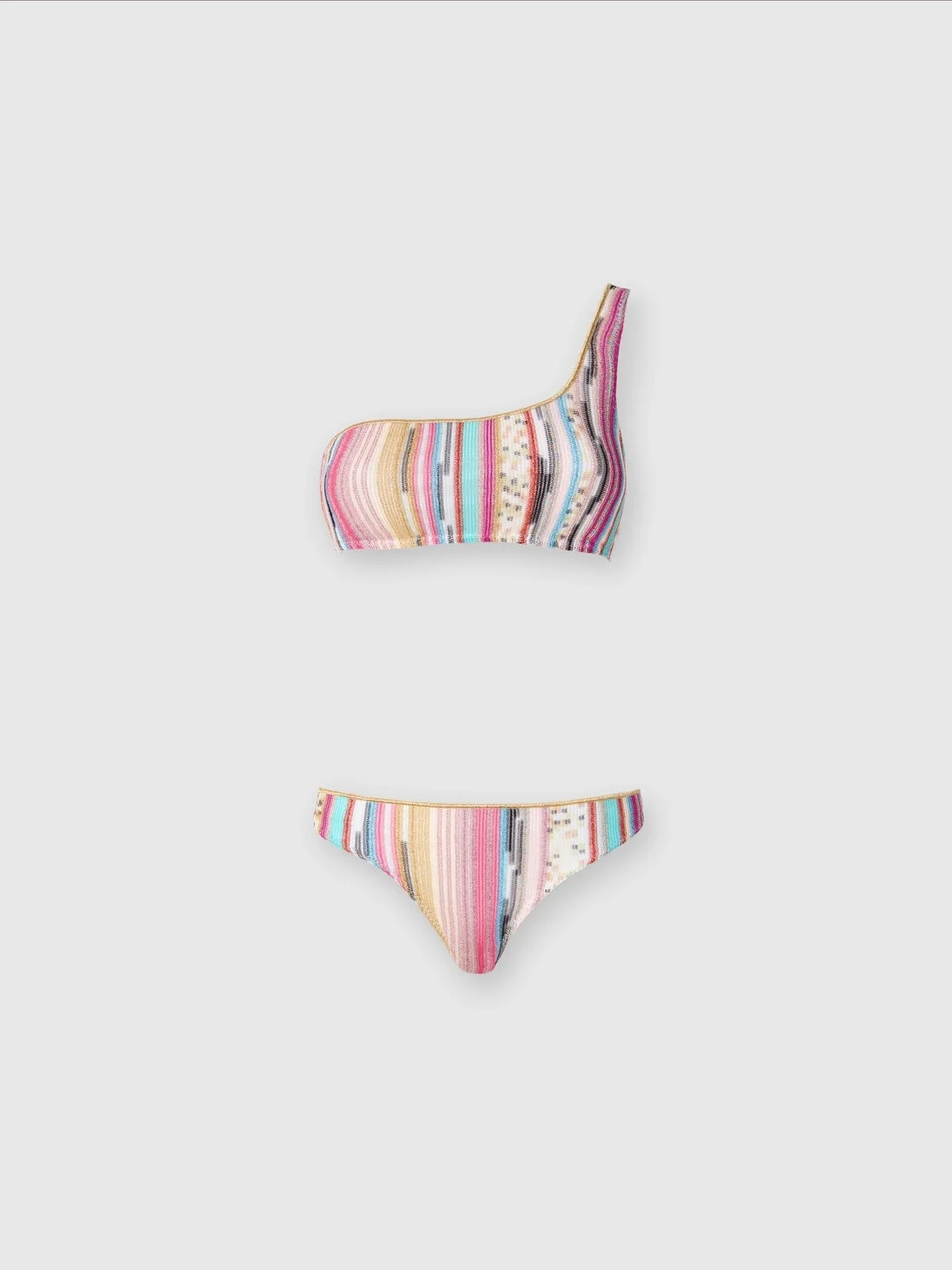 Crafted from a slub viscose blend with lurex reflections, the women's one-shoulder bikini expresses Missoni's eclectic DNA. The one-shoulder top design is animated by the striped motif that intertwines with the iridescent texture of the lame, creating a sophisticated play of light. The classic briefs complete the look, for a garment that perfectly blends elegance and dynamism. MORE DETAILS - One-shoulder bikini - Flamed viscose and lame - Striped pattern Composition: EXTERNAL:88%Rayon, 12%Metal Fiber; LINING : 80%Polyamide, 20%Elastane Care instructions: Hand wash ; Do not tumble dry ; Do not dry clean ; Do not iron ; Do not bleach Made in: Italy Product ID MC23SP02BR00ZZSM9L1