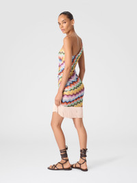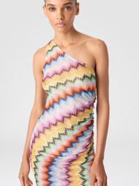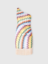 This short one-shoulder women’s cover-up with fringe at the bottom offers a contemporary and elegant interpretation of classic summer style. The raschel workmanship, which creates an effect of shaded micro and macro stripes, forms a dynamic zigzag, recalling Missoni’s famous geometries in a modern key. The contrasting fringes complete the design, adding a touch of movement and lightness, ideal for sunny days. MORE DETAILS - Short one-shoulder beach cover-up - Fringed hem - Raschel knit with shaded macro and micro stripe pattern - Zigzag background Composition: EXTERNAL:100%Polyester; Sewing thread:100%Polyester; INSERTS:100%Acetate Care instructions: Ironing maximum temperature 110°C - without steam ; Dry cleaning in tetrachloroethene ; Do not tumble dry ; Iron with a cloth between ; Do not wash ; Do not bleach Made in: Italy Product ID MC25WQ00BR013XSM9UC