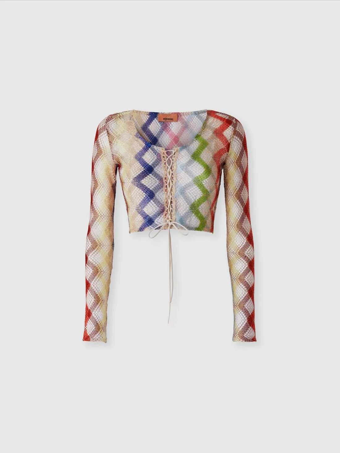The striped Raschel work and zigzag pattern, combined with mesh, give texture to the design, while the central tie and U-neckline enhance a modern and feminine silhouette. MORE DETAILS - Women's crop top - Lame and mesh workmanship - Front tie fastening - Long sleeves Composition: EXTERNAL:73%Rayon, 14%Metal Fiber, 13%Polyamide Care instructions: Ironing maximum temperature 110°C - without steam ; Dry cleaning in tetrachloroethene ; Do not tumble dry ; Do not wash ; Do not bleach Made in: Italy Product ID MS25SK0DBR012SSM9QN