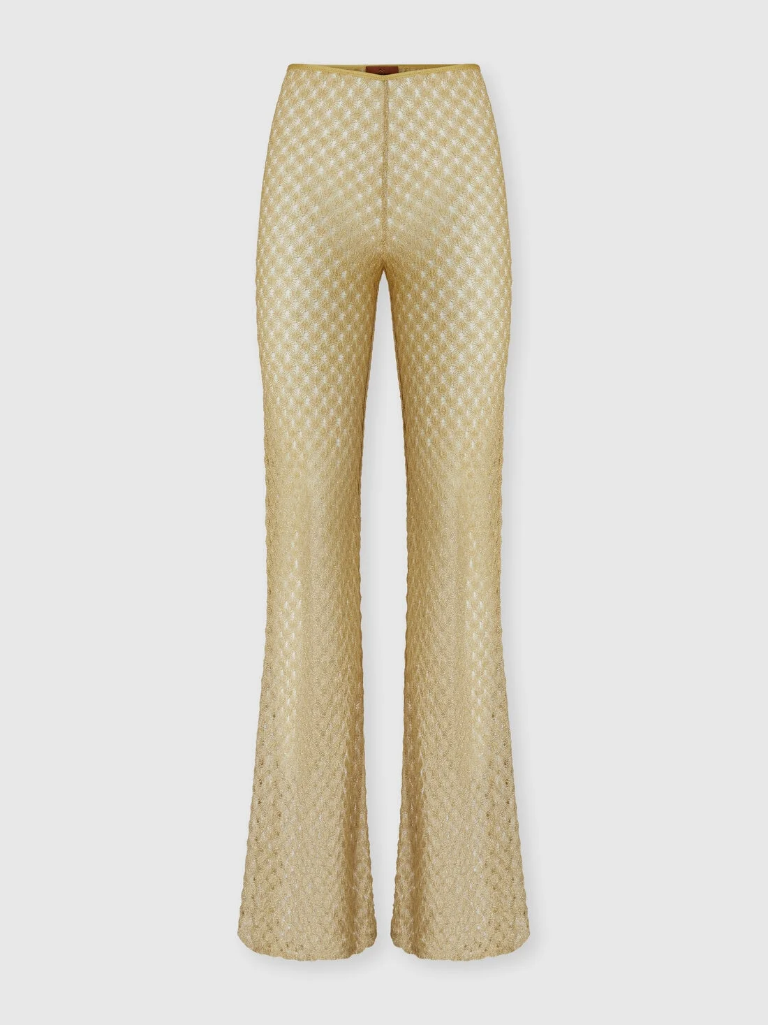 MORE DETAILS - Women's flare beach cover-up pants - Raschel lace knit - Spiderweb pattern - Viscose lame Composition: EXTERNAL:83%Rayon, 17%Metal Fiber; LINING : 80%Polyamide, 20%Elastane Care instructions: Ironing maximum temperature 110°C - without steam ; Dry cleaning in tetrachloroethene ; Do not tumble dry ; Do not wash ; Do not bleach Made in: Italy Product ID MC25SI00BR014RS10BY