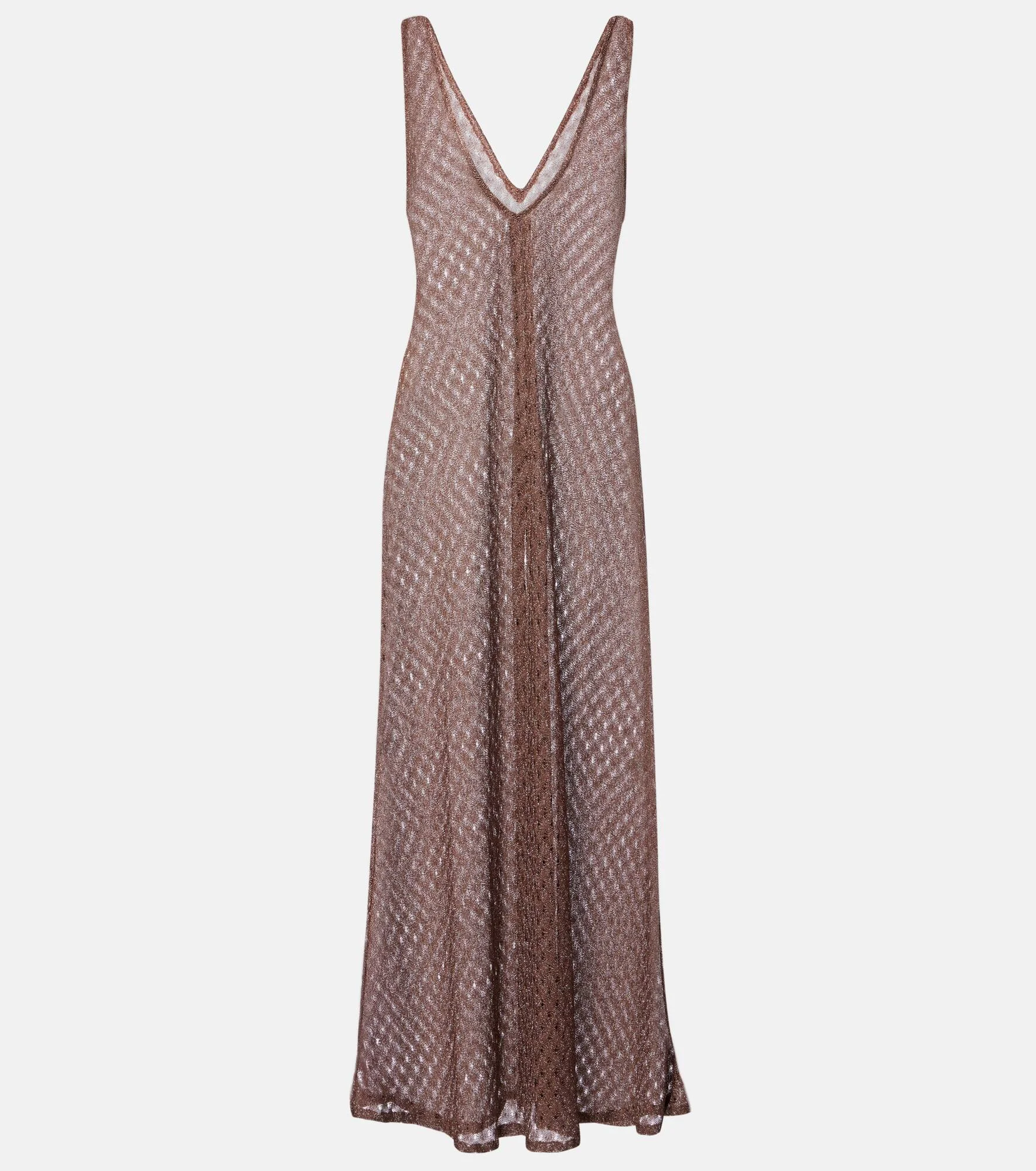 Missoni’s craftsmanship, iconic patterns, and bold color palettes bring a sense of sophisticated joy to dressing. Made from open-knit lame, this maxi dress doubles as a chic maxi dress, as well as a beach cover-up, complete with a plunging neckline and fitted silhouette. Product Details - Material: 87% viscose, 13% metallic fibres - Care instructions: dry clean - Made in Italy - Color: brown - Designer color name: Brown - Item number: P01107464 Size & Fit - True to size - Low back - Cinched waist - Stretchy fabric - slit length 67cm-26.5" - The model seen in the picture is 178cm-5'10" and wearing a size IT 38