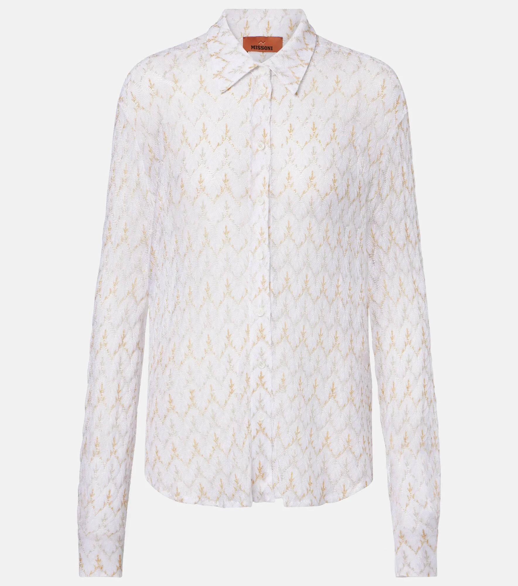 Celebrating the heritage of Italian knitwear, Missoni weaves signature colors and textures into a uniquely elegant aesthetic. Crafted in Italy, this lame shirt features an open-knit motif, creating a delicate sheer effect. Product Details - Material: 96% viscose, 4% metallic fibres - Care instructions: dry clean - Made in Italy - Color: white - Designer color name: White And Gold - Item color: white, gold - Closure: buttoned front - Item number: P01142930 Size & Fit - True to size - Dropped shoulders - Semi-sheer - Designed for a loose fit - Stretchy fabric - Falls below the hip - Height of model is 173cm-68" and wears a size IT 40