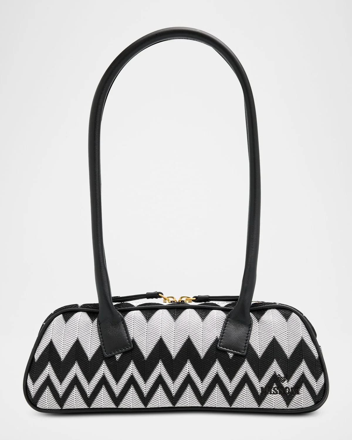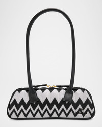 Made of cotton and leather, this Missoni slim shoulder bag sports the optical wave design and classic bowling silhouette Rolled shoulder straps Twoway zip top Interior, one card slot Lining: Cotton Approx. 3.3"H x 10.5"W x 3"D Made in Italy