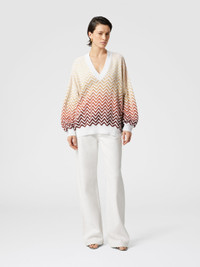 With its loose, relaxed silhouette, this oversized sweater is a celebration of Missoni's textile art. The jacquard degrade chevron motif creates a harmonious visual effect, while the V-neck adds a touch of fluidity, emphasizing the versatility and craftsmanship of the garment. MORE DETAILS - Crew neck sweater - Viscose jacquard knitting - Degrade chevron pattern - 3/4 sleeves Composition: EXTERNAL:51%Cotton, 49%Rayon Care instructions: Dry cleaning in tetrachloroethene - mild process ; Ironing maximum temperature 110°C - without steam ; Do not tumble dry ; Iron inside out ; Dry inside out ; Dry flat ; Do not wash ; Do not bleach Made in: Italy Product ID DS25SN0MBK044VSM9M9
