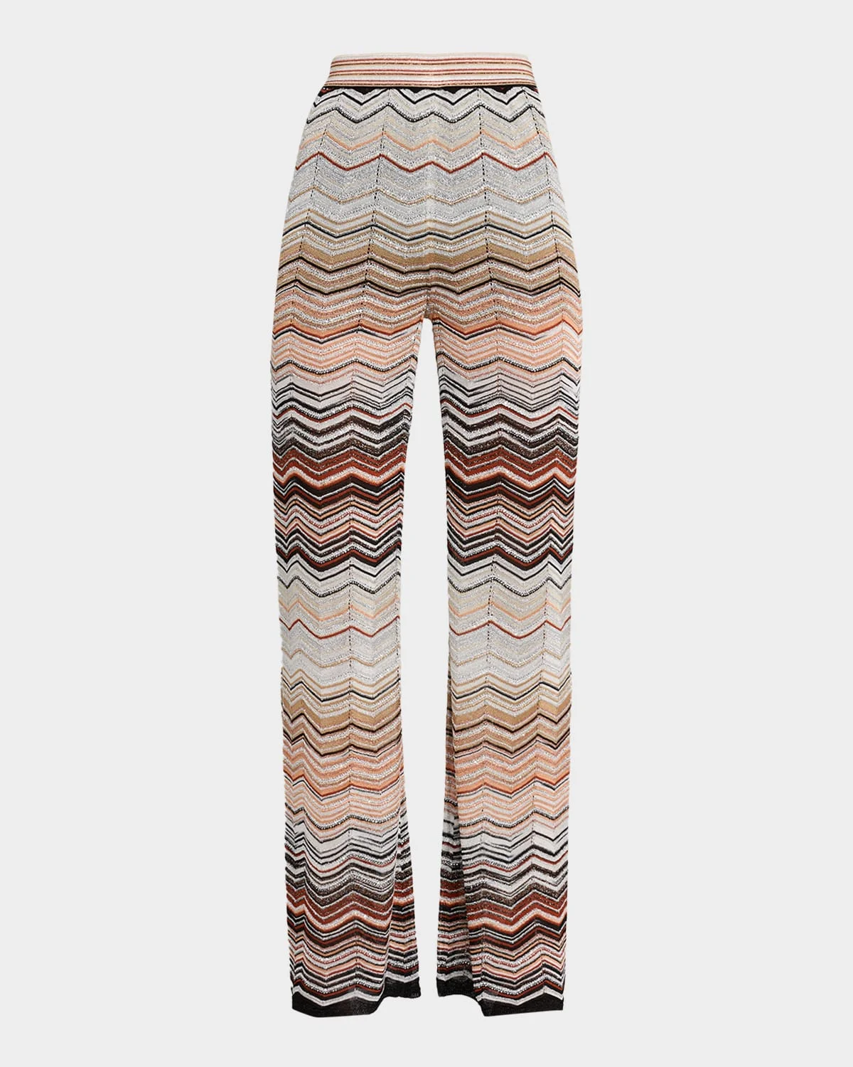 These trousers & nbsp;from Missoni are crafted from metallic chevron knit that shimmers with micro paillettes High rise Flat front Straight legs Full length Pull-on style Viscose/Lurex® metallic fibers/nylon/polyamide Lining: Elastane/polyester Made in Italy SIZE & FITModel measurements: 5 & apos;10" tallModel is wearing a US size 4/Small