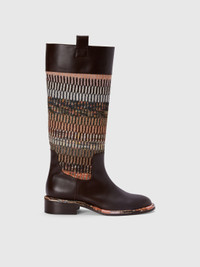 The patterned fabric lit up by the flashes of lame adds a new and feminine touch to women's leather boots. The classic model with rounded toe, side tabs and leather heel acquires a twist pop thanks to the contrasting profile of the sole. MORE DETAILS - Leather Boots - Lame fabric insert - Eyelets shoe sock - Profiled textile sole Composition: UPPER:72%Rayon, 18%Metal Fiber, 10%Calf leather; LINING : 100%Pelle Capra; SOLE:100%Domestic calf leather Made in: Italy Product ID LS24WY0KBV00GZS80DF