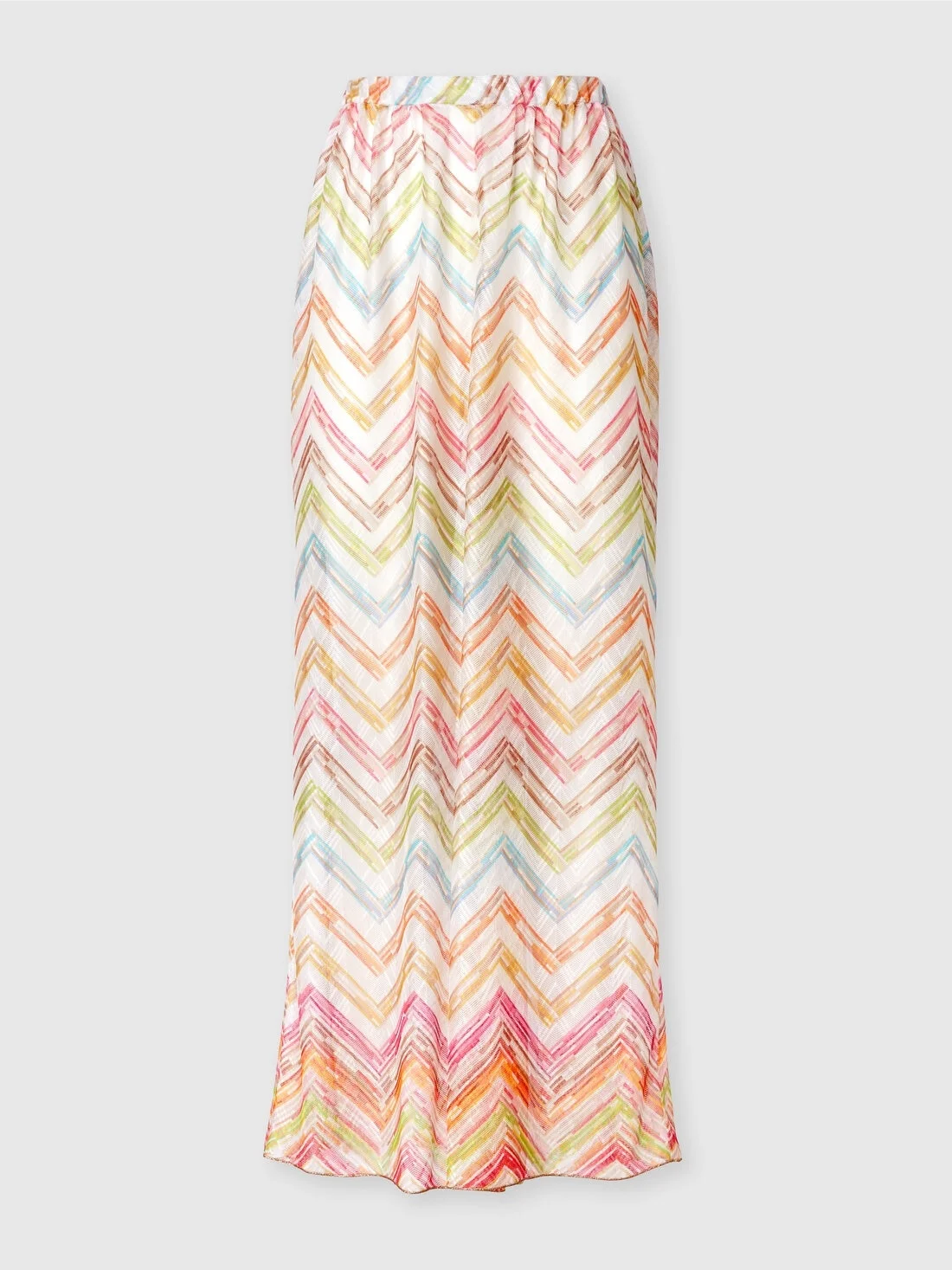 These slip-up cover-ups in printed tulle with raschel workmanship interpret luxury in a Missoni key. The loose, flowing silhouette with a see-through effect lends sumptuous elegance, while the pattern brightens up the garment with dynamism. A must-have for those who want a sophisticated and versatile look even off the beach. MORE DETAILS - Pantapalazzo cover-up - Tulle Printed - Zig zag pattern - Raschel processing Composition: EXTERNAL:100%Polyester Care instructions: Ironing maximum temperature 110°C - without steam ; Dry cleaning in tetrachloroethene ; Do not tumble dry ; Do not wash ; Do not bleach Made in: Italy Product ID MC23SI02BR010XSM9N4
