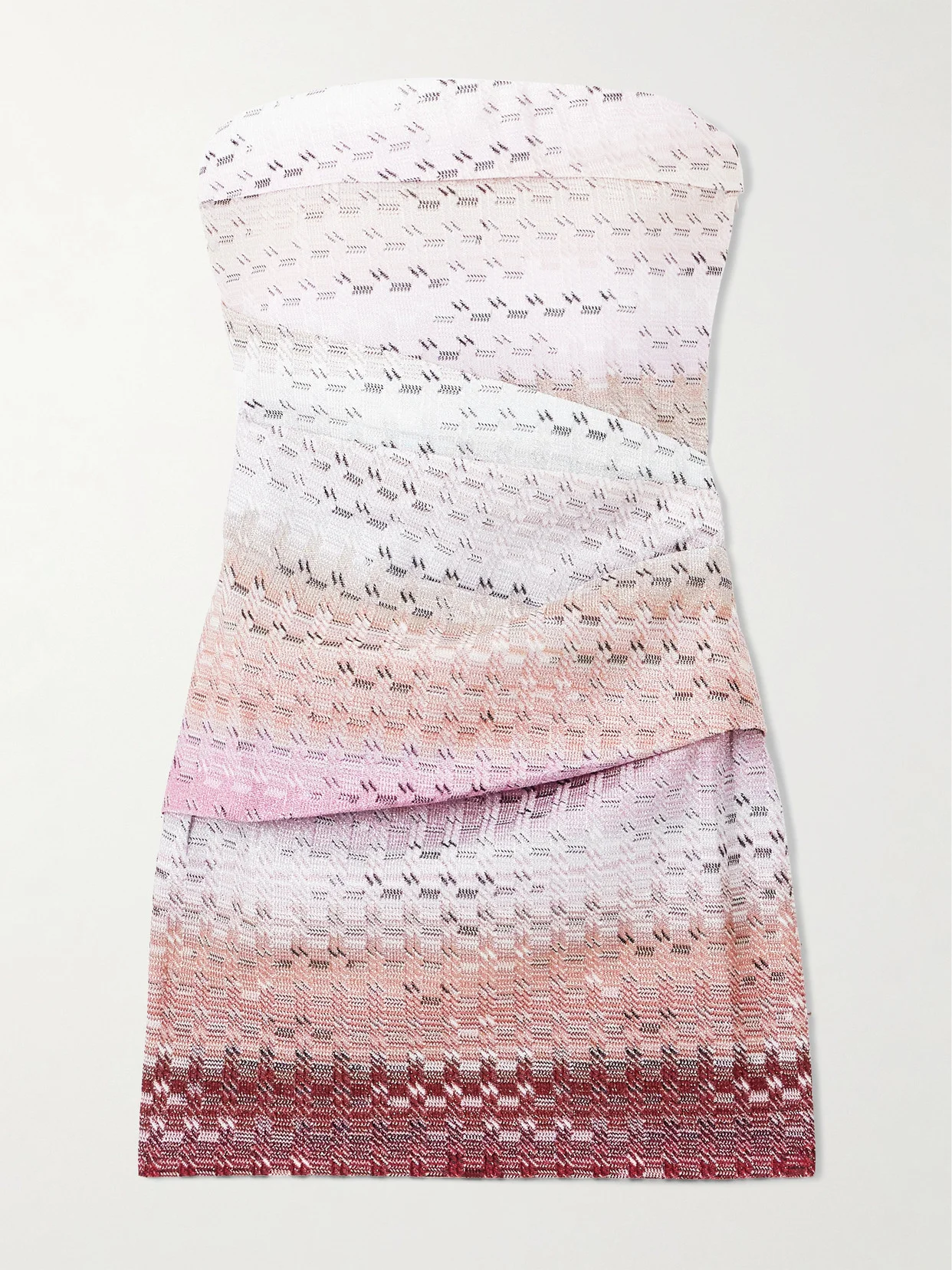 Missoni's mini dress is flecked with metallic fibers that add a subtle sparkle to its colorful degrade. Crochet-knitted for a textured finish, it has a pleated panel at the waist that draws in your figure elegantly.