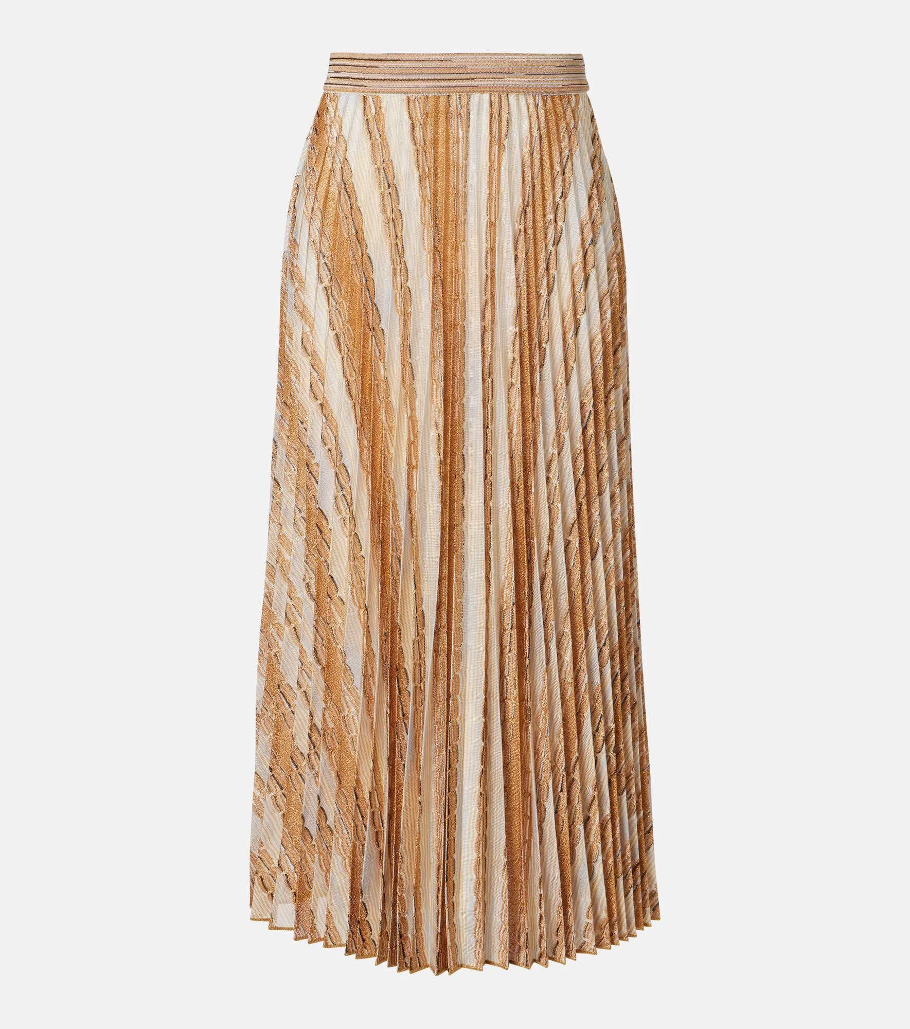 Missoni’s craftsmanship, iconic patterns, and bold color palettes bring a sense of sophisticated joy to dressing. Cut from featherweight fabric, this plisse midi skirt is finished with a multicolored print and shimmering metallic accents. Product Details - Material: 67% viscose, 24% polyester, 9% metallic fibres - Care instructions: dry clean - Made in Italy - Color: gold - Designer color name: Gold Tones - Elasticated waistband - Item number: P01108677 Size & Fit - True to size - Elasticated waist - Slightly stretchy fabric - High-waisted - The model seen in the picture is 178cm-5'10" and wearing a size IT 38