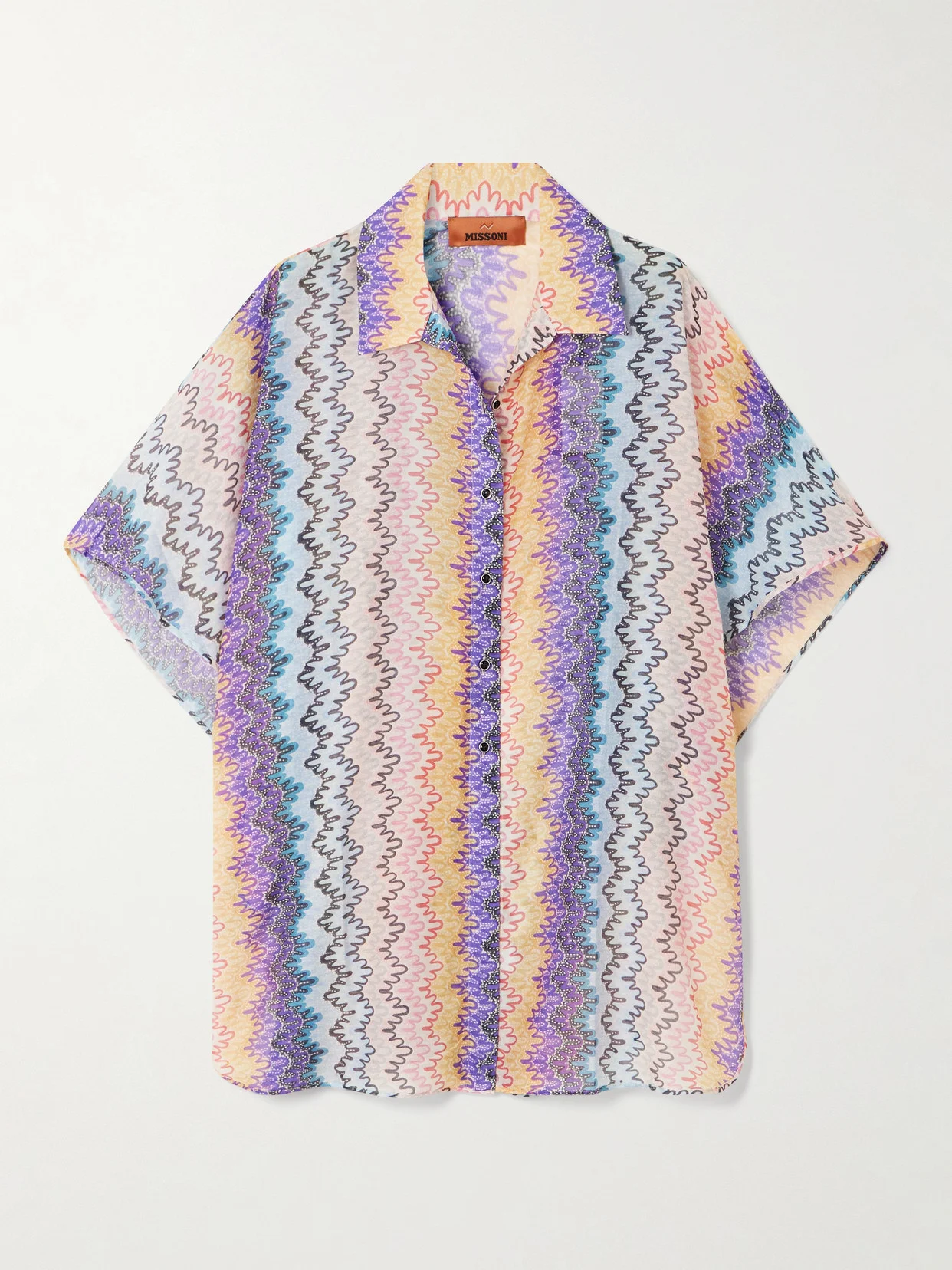 Missoni's shirt is made from cotton and silk-blend and printed with colorful wavy stripes. It has a relaxed fit and wide sleeves. Wear yours open over a tank and linen pants or style it as a coverup when heading to the beach.