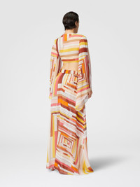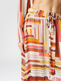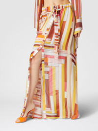 This long cover-up skirt in printed silk has a fluid and light silhouette, perfectly complemented by the geometric pattern. The front closure and the deep side slit accentuate the femininity of the design, offering a touch of dynamism and modernity. A versatile garment, designed for those who love to combine comfort and style in a single sophisticated look. MORE DETAILS - Cover-up skirt - Long model - Front closure - Printed Silk - Side slit Composition: EXTERNAL:100%Silk Care instructions: Ironing maximum temperature 110°C - without steam ; Dry cleaning in tetrachloroethene ; Do not tumble dry ; Do not wash ; Do not bleach Made in: Italy Product ID MS25SH05BW00USS80CW