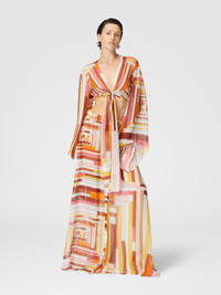 Playing on bold lines and bold asymmetries, the printed silk crop top embodies a contemporary design that enhances the contrast between geometry and softness. The front lacing creates a visual tension that balances the fluidity of the fabric, while the asymmetrical cut transforms every perspective, giving the garment a unique character. A perfect encounter between form and movement, in which the harmony of colors is expressed with elegant ease. MORE DETAILS - Crop top - Printed Silk - Wide sleeves - Front knot Composition: EXTERNAL:100%Silk Care instructions: Ironing maximum temperature 110°C - without steam ; Dry cleaning in tetrachloroethene ; Do not tumble dry ; Do not wash ; Do not bleach Made in: Italy Product ID MS25SK04BW00USS80CW