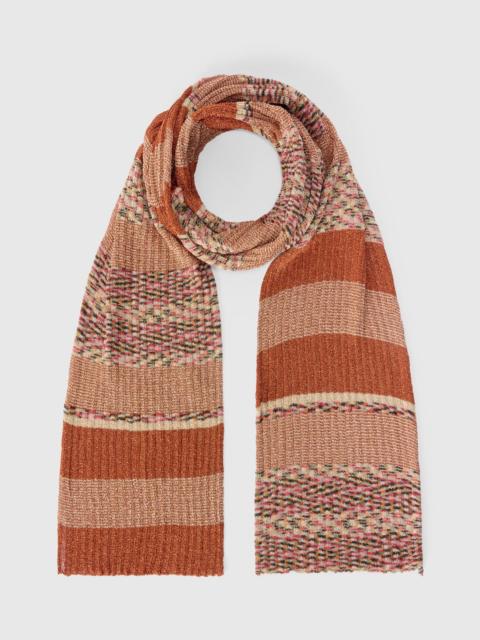 A stylish and comfortable accessory, this women’s wool and viscose scarf features a ribbed knit with stripes and chevron inserts. A play of textures and lines adds depth to the piece, making it perfect for elegantly and personally completing any look. MORE DETAILS - Women’s ribbed scarf - Wool and viscose blend - Striped pattern with chevron inserts Composition: EXTERNAL:60%Rayon, 40%Wool Care instructions: Dry cleaning in tetrachloroethene ; Do not tumble dry ; Do not wash ; Do not iron ; Do not bleach Made in: Italy Product ID LS25WS0OBV00IHSM67S