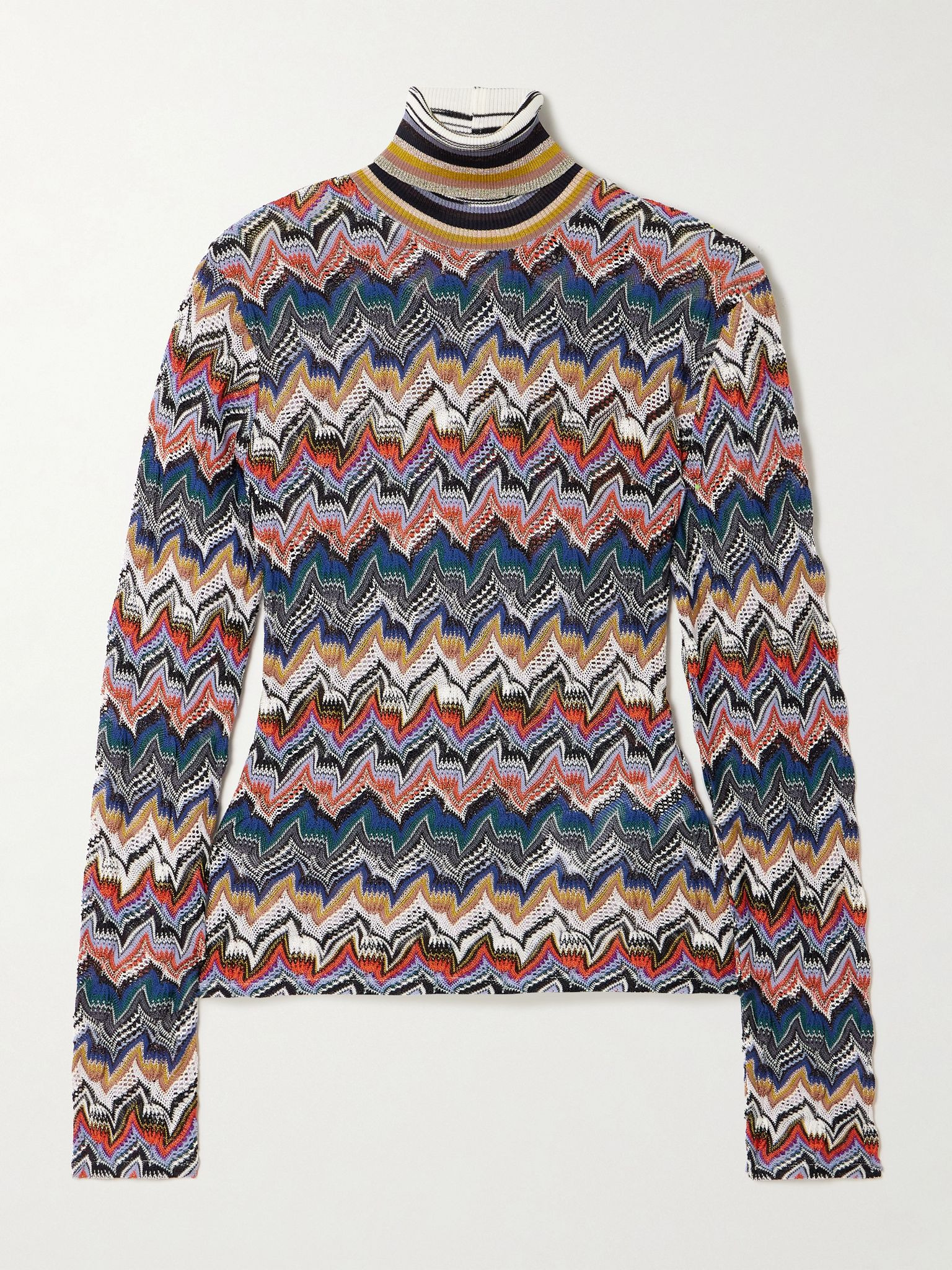 Missoni continually reinvents its iconic crochet-knit with fresh color palettes and refined pattern updates. This captivating sweater is designed for a close fit and has a turtleneck. Wear yours as a set with the matching skirt in our edit. Size & Fit - Fits true to size, take your normal size - Designed for a close fit - Lightweight knit - Model is 180cm/ 5'11" and is wearing an IT 40 Model measurements: - Bust: 80cm/ 31.5" - Waist: 65cm/ 25.5" - Hip: 89cm/ 35" Details & Care - Multicolored crochet-knit - Slips on - 66% viscose, 30% wool, 4% metallic fibers - Machine wash